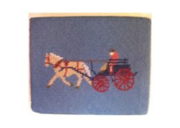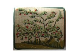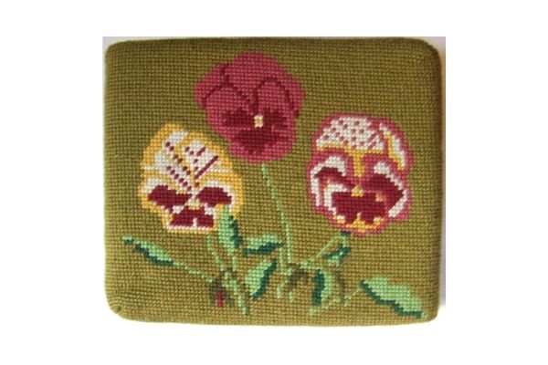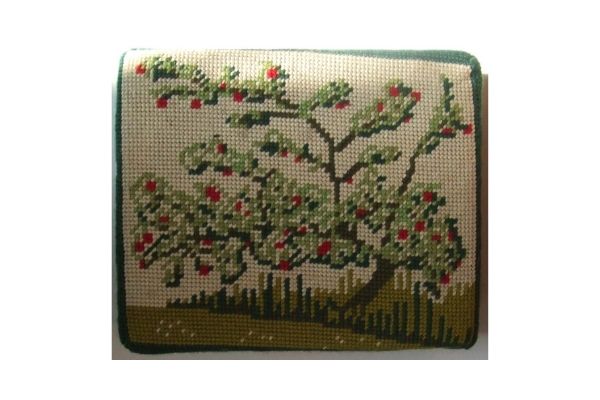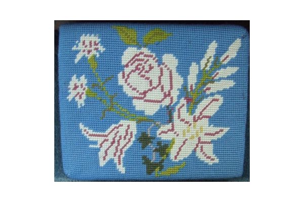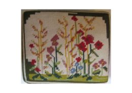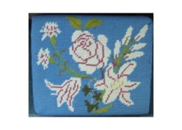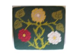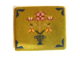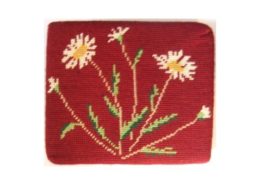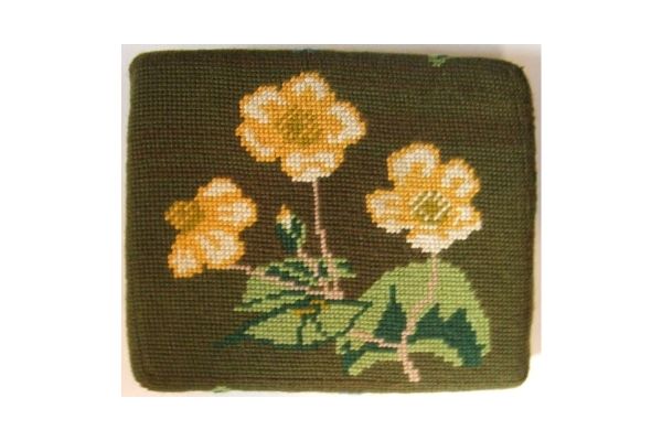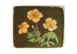 Church kneelers lead off with a wreathed shield dedicated to All Saints, the church’s Patrons. The emblems of many saints follow. The first represent three of the Evangelists and the two Apostles, James the Greater and James the Less. Then comes St Cecilia. The remaining saints, represented by flowers, conveniently give their names.
